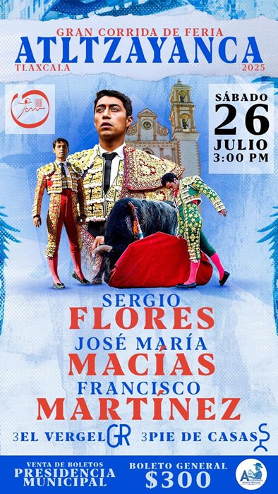 La empresa -Feria Toro- informa que la emoción de la tauromaquia regresa con fuerza el próximo sábado 26 de julio de 2025, a partir de las 15:00 horas, con el montaje de la atractiva corrida de la feria, en honor a Santiago Apóstol, en el emblemático coso -La Morenita- de Atltzayanca, en el corazón del estado de Tlaxcala.