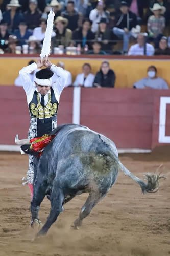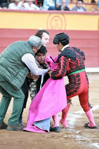 Mojito al entrar a matar a su primero fue alcanzado por el toro y recibió impresionante voltereta, visiblemente lastimado se quedó en el ruedo e intentó finiquitar al toro pero le tocaron los tres avisos.
