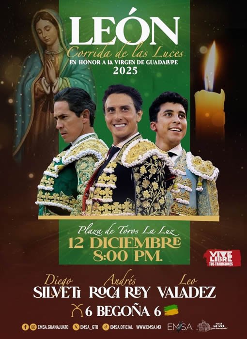 La empresa Espectáculos Monterrey- (EMSA), a través de la coordinación operativa del coso Monumental -La Luz- de León, Guanajuato, de manera oficial, anuncia la realización de la tradicional y emotiva -Corrida de las Luces-, misma que tendrá lugar el próximo viernes 12 de diciembre de 2025, a partir de 20:00 horas y que, como se sabe, es en honor a la Virgen de Guadalupe, una fecha, sin duda, profundamente significativa para el pueblo mexicano.