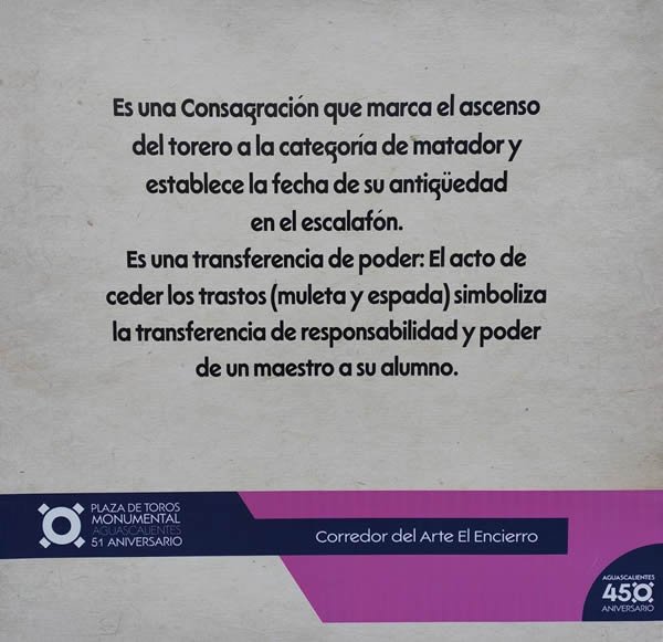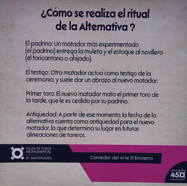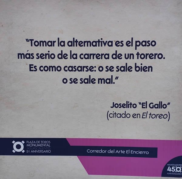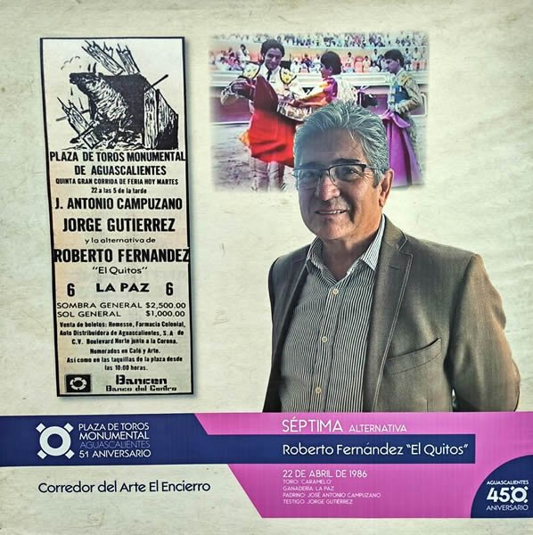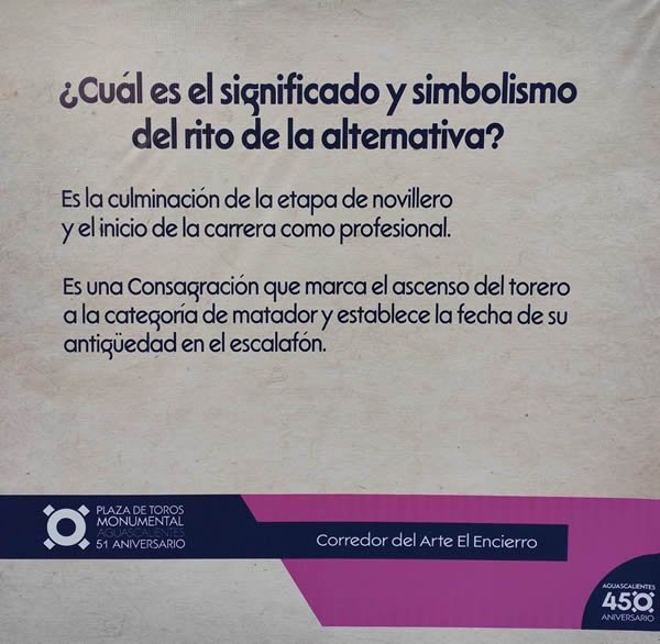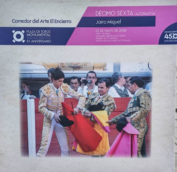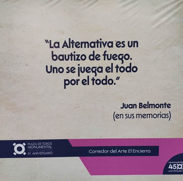 Apenas iniciada la noche de este miércoles 19 de noviembre de 2025, en el Corredor del Arte -El Encierro-, en pleno andador principal de la Feria Internacional de San Marcos, dentro de las actividades taurinas del CDL aniversario de la fundación de la ciudad de Aguascalientes, de los 51 años de su coso Monumental y en el marco del cierre de la II Temporada de Otoño, se inauguró la exposición iconográfica de las 25 alternativas que se habrán concedido hasta este sábado 22 de noviembre, en la primera plaza del estado, cuando le sea concedida al mexiqueño Bruno Aloi.