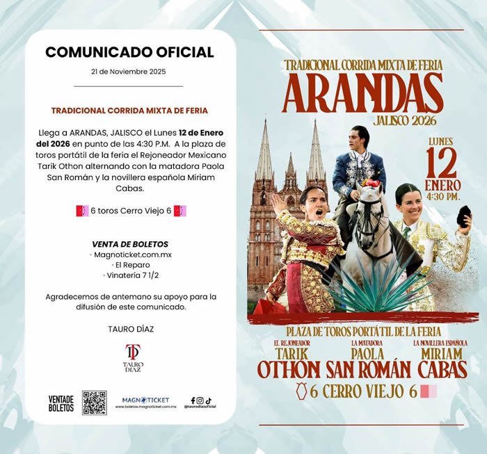 Llega a Arandas la corrida tradicional de Feria, el lunes 12 de enero del 2026