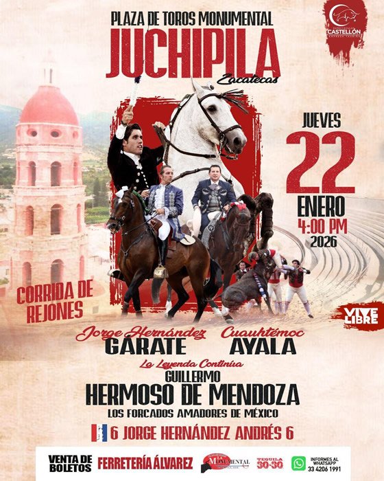 Se informa que, del sábado 10 al domingo 25 de enero de 2026, se llevará a cabo la tradicional Feria Regional de Juchipila, Zacatecas, en honor al santo patrono San Sebastián y, como ya es costumbre, tendrá actividad taurina a través del montaje de una corrida de toros para rejones.