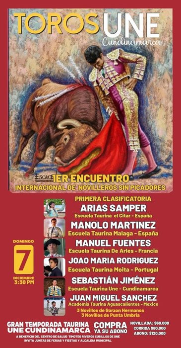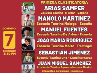 Cabe señalar que, en el caso del aguascalentense Juan Miguel Sánchez, representante de la Escuela Taurina Municipal de Aguascalientes -Alfonso Ramírez ‘El Calesero’-, llega a este su primer compromiso en el extranjero, con ocho festejos sin caballos toreados, tres de ellos vistiendo de luces y, que, para ello, viajará este decembrino jueves 4 a suelo colombiano.