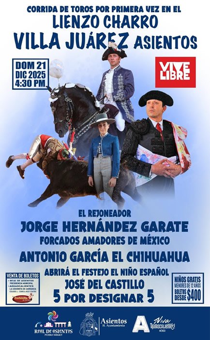 Se informa que, el próximo domingo 21 de diciembre de 2025, en el coso charro taurino de Villa Juárez, centro económico y comercial más importante del municipio de Real de Asientos, -Pueblo Mágico- desde 2006, situado a 35 kilómetros de la capital del estado de Aguascalientes, se llevará a cabo por primera vez un festejo taurino.