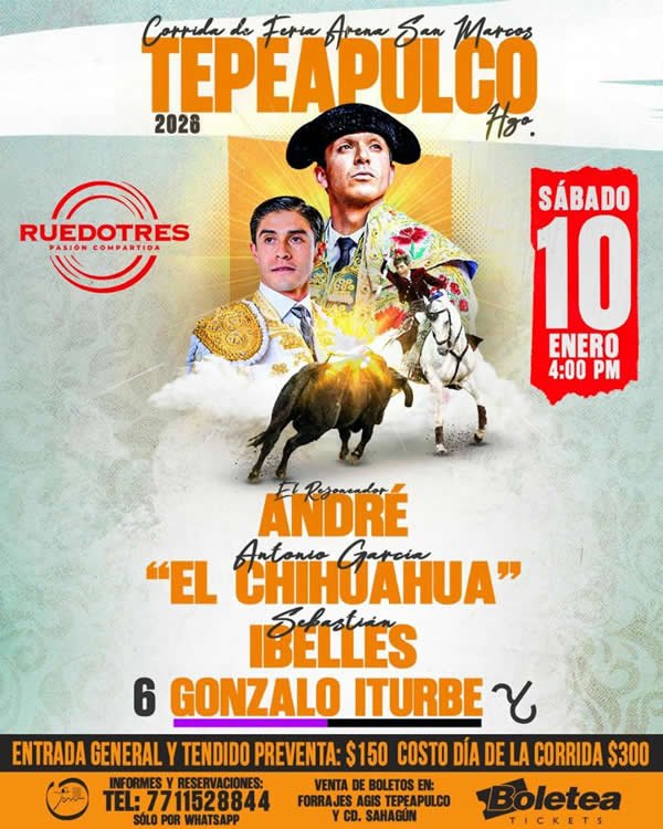 La empresa -Ruedo Tres- informa, de manera oficial, sobre los detalles del montaje de la corrida de toros mixta que se llevará a cabo en el coso Monumental -Arena San Marcos- y en el marco de las fiestas patronales de Tepeapulco, Hidalgo 2026, en honor y devoción al Padre Jesús, a celebrarse durante la primera quincena de enero.
