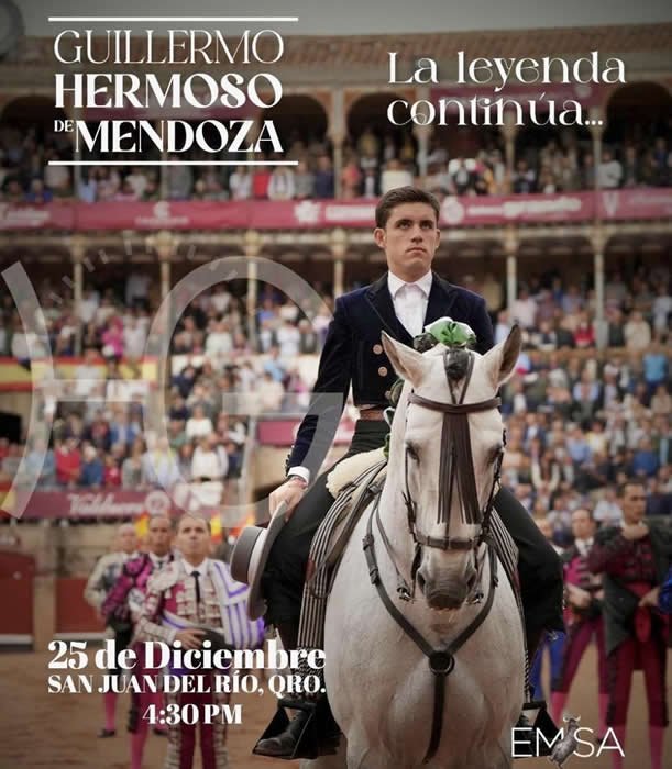 Se informa que, el rejoneador navarro Guillermo Hermoso de Mendoza anuncia su esperada reaparición en los ruedos, marcando así el cierre de 2025 con una intensa actividad taurina y, además, de dar inicio al Año Nuevo 2026 con fechas de gran relevancia en varios cosos de la geografía taurina del país.