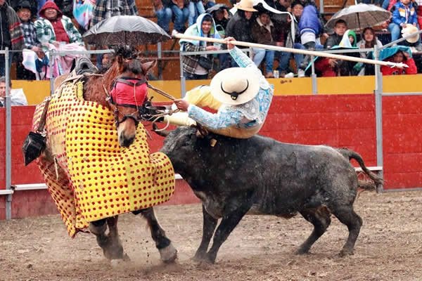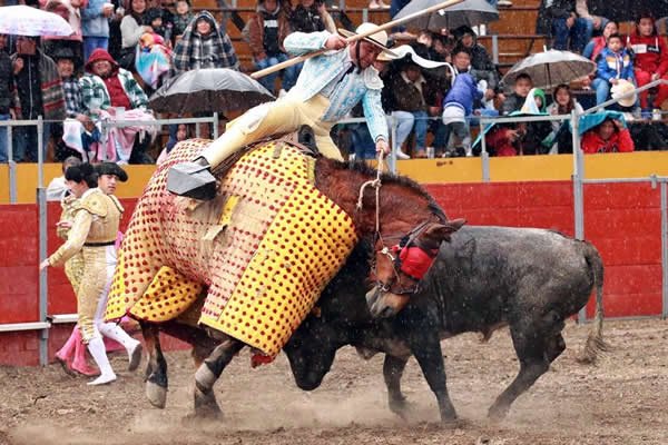 Santo Tomas Hueyotlipan, Puebla, 2a Corrida de la Fiesta Patronal, Plaza Portátil -La Giralda- lleno hasta la bandera en tarde con lluvia intermitente.
