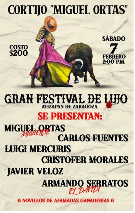 Los Matadores de Toros Miguel Ortas -Miguelete- y Luigi Mercuris han llegado a un importante acuerdo para organizar Festejos Taurinos en lugares cercanos a la ciudad de México con la intención de motivar a la gran afición de está zona que resiente el ayuno impuesto por la corriente prohibicionista actual, este emprendimiento será una expresión de Libertad y dará inicio con un extraordinario Festival el próximo sábado 7 de Febrero a las 2 de la tarde en el Cortijo Miguel Ortas de Atizapán, Estado de México dónde ambos matadores acompañados del diestro Tlaxcalteca Carlos Fuentes y de los toreros Cristopher Morales, Javier Veloz y Armando Serratos -El Dandy- lidiaran a la usanza española 6 Novillos de afamadas ganaderías.