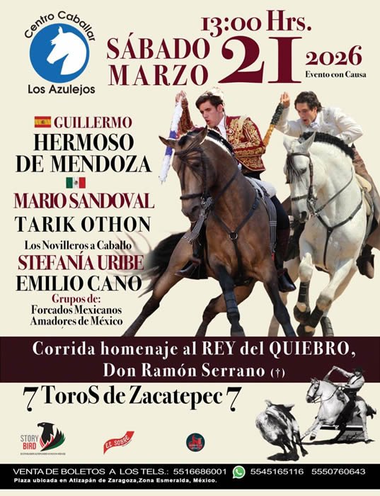 La empresa de la plaza -Conchita Cintrón- del Centro Caballar -Los Azulejos- de Atizapán de Zaragoza, en el Estado de México anuncia el primer festejo del año, con una corrida mixta de rejones de carácter benéfico y en homenaje póstumo a don Ramón Serrano -El Rey del Quiebro-, el sábado 21 de marzo, a partir de las 13:00 horas.