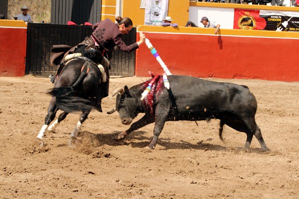 Abrió plaza la novillera Rejoneadora Stefanía Uribe que mostró avances importantes al colocar dos rejones de castigo y luciéndose con cuatro banderillas largas y tres de cortas, con buen manejo de sus cabalgaduras y finalizó con el de muerte, tardando en doblar el de Zacatepec, para dar vuelta al ruedo entre aplausos.