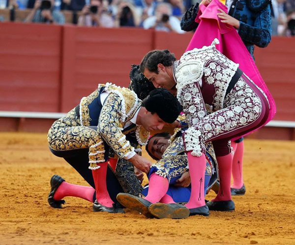 Sevilla, España.- Plaza de La Maestranza. Lleno de -No hay billetes-, en tarde de caluror sofocante. Toros de Hermanos García Jiménez (6o., sobrero sustituto de uno que se partió un pitón de salida), de correcta presentación -más terciado el 2o., y con más volumen y cuajo el suplente), y de muy buenas hechuras, que dieron, sin excepción, un juego excelente, con más o menos raza pero todos con nobleza y calidad en las embestidas. Morante de la Puebla (azul pavo y oro): Oreja con ligera petición en el único que mató. Borja Jiménez (violeta y oro): Oreja, vuelta en el que mató por Morante, y oreja con petición. Tomás Rufo (azul noche y oro): Silencio en su lote. Incidencias: El parte médico de la cornada de Morante establece la siguiente lesión: -Herida por asta de toro en margen anal posterior con trayectoria de unos 10 cm, lesionado parcialmente musculatura esfinteriana anal y con perforación en cara posterior de recto de 1.5 centímetros. Lavado de herida, y reparación de pared rectal y aparato esfinteriano. Drenaje aspirativo en espacio postanal y retro rectal. Pronóstico: Muy grave. Firmado: Doctor Octavio Mulet-.