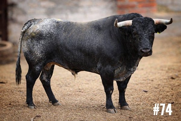 Número 74, negro, nevado de los cuartos traseros, paliabierto.