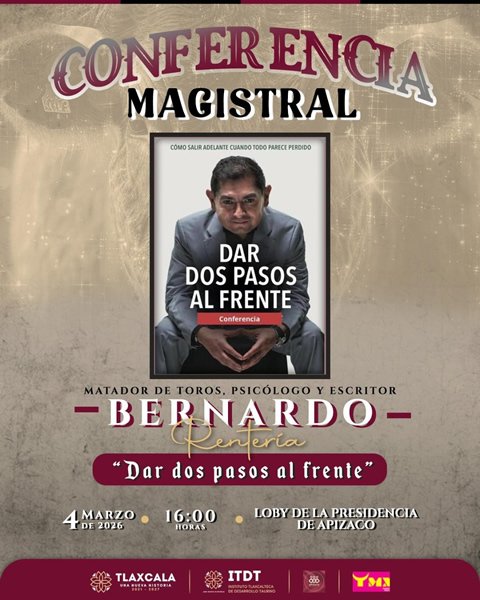 Este día el Instituto Tlaxcalteca de Desarrollo Taurino ITDT, que dirige el Matador José Luis Angelino, en Coordinación con el Presidente Municipal de Apizaco C. Javier Rivera Bonilla y el Director de Turismo Municipal C. Sergio Jair Méndez, presentaron el programa de eventos dentro de la Semana Cultural Taurina de la Feria Apizaco 2026 dirigida a la afición y público en general aunque la primera conferencia magistral que se realizará el 4 de Marzo a las 16:00 horas se dirige en especial a jóvenes y estudiantes pues es la presentación del libro -Dar dos pasos al frente- del Matador de Toros en retiro y Psicólogo Bernardo Rentería, un libro impresionante donde aborda reflexiones íntimas y profundas sobre la vida y la entereza en momentos difíciles.
