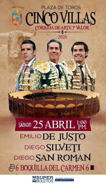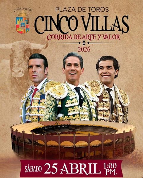 La Plaza de Toros Cinco Villas comprometida con la tauromaquia nacional y luego del rotundo éxito de la corrida del pasado 22 de febrero, anuncia la celebración de la -Gran Corrida de Arte y Valor-, que se llevará a cabo el sábado 25 de abril a la 1:00 p.m., en una tarde que reunirá a destacadas figuras del toreo y que promete grandes emociones para la afición.