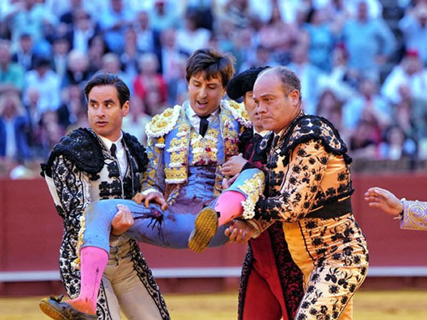 -Herida por asta de toro en cara interna tercio superior del muslo derecho, con trayectoria total de 35 centímetros. Con trayectoria descendente de 20 centímetros y ascendente de 15 centímetros que produce extensa rotura de músculos vasto interno y sartorius, disecando el paquete vasculo-nervioso, sin producir lesión vascular.